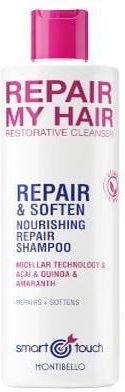 Smart Touch Repair My Hair | Odbudowujący szampon micelarny do włosów zniszczonych 300mlSzampon Montibello Smart Touch Repair My Hair to doskonałe rozwiązanie dla osób, których włosy potrzebują oczyszczenia oraz odbudowy. Micelarna formuła produktu, łagodna dla skóry głowy i włosów wzbogacona została o jagody acai, komosę ryżową oraz amarantus doskonale oczyszczają kosmyki z wszelkich zanieczyszczeń, oraz środków do stylizacji włosów dodatkowo je odżywiając i wzmacniając. Produkt przeznaczony do codziennego stosowania w szczególności w przypadku zniszczonych i porowatych włosów. Właściwości: